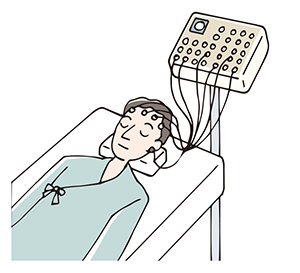 脳は眠っているときも目覚めているときも、微弱な電気を出し続けています。その電気信号を増幅し記録するのが脳波検査です。また、睡眠時無呼吸症候群の重症度判定や、脳死の判定などに利用されています。てんかん発作が疑われる患者さんには、光や音、深呼吸などいろいろな刺激を与えて脳の反応を調べます。